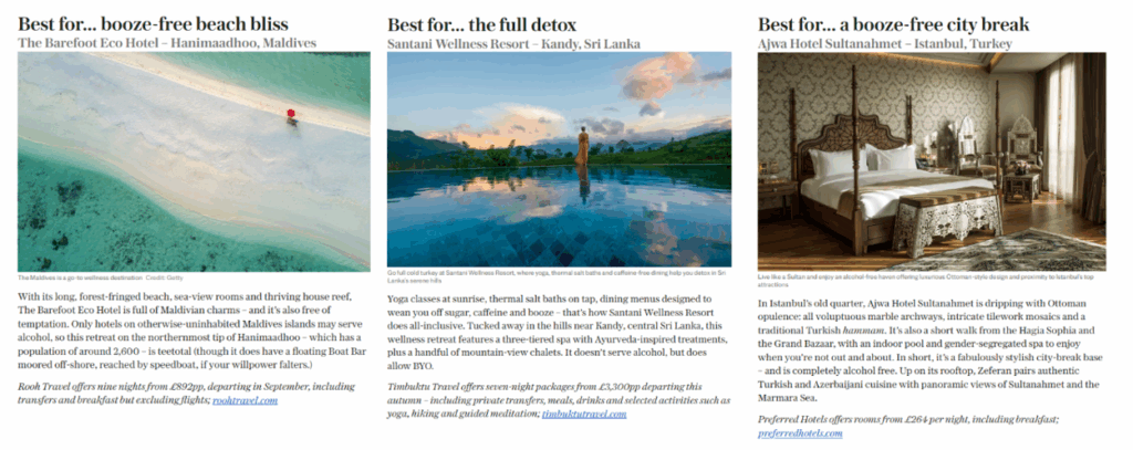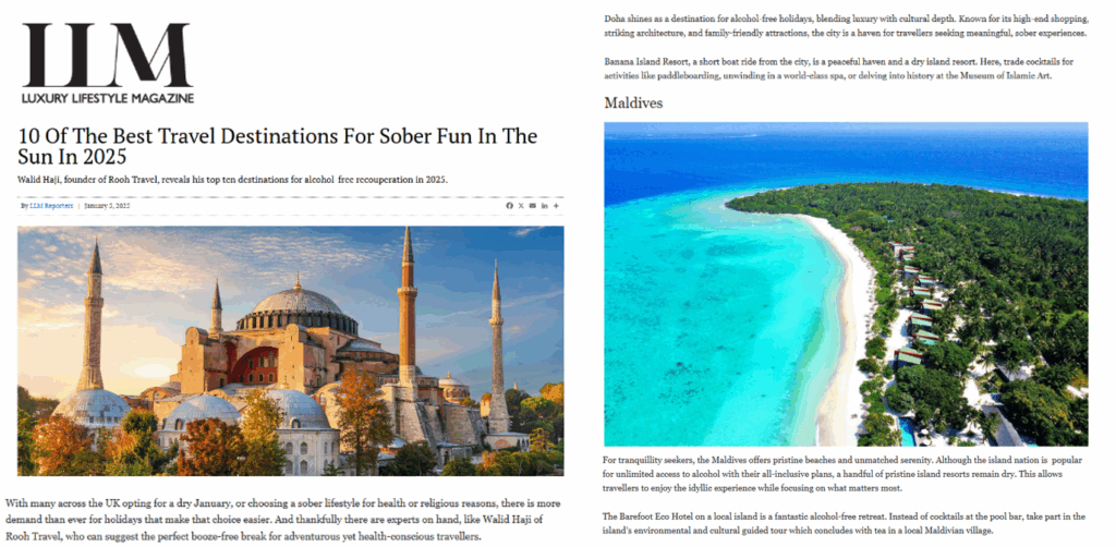 Source: https://www.luxurylifestylemag.co.uk/travel/10-of-the-best-travel-destinations-for-sober-fun-in-the-sun-in-2025/ - The Telegraph – Featured Rooh Travel insights in “The Best Places for an Alcohol-Free Holiday.”