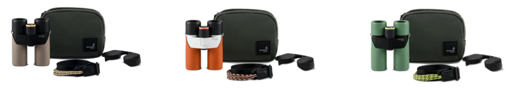 Binocular colour options: Desert Orange, Mountain Green, and Safari Brown